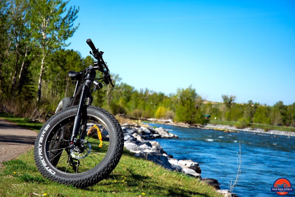 The Cobra Pro also has some of the widest tires fitted to any eBike at 4.8 inches wide by 26 inches diameter, which makes it as wide or wider than many motorcycle front tires. These tires are knobbly with an aggressive grip pattern, designed to grab into any surface, loose or paved, and provide traction. These tires are also one of the biggest issues with the bike, in the sense that they need the electric motor to provide the torque needed to move them. You can pedal along without pedal assist or the battery being charged just fine on flat ground or downhill, but even the slightest incline will prove to be insurmountable because of the contact patch being larger than 99.9% of people can provide force with their legs to overcome.